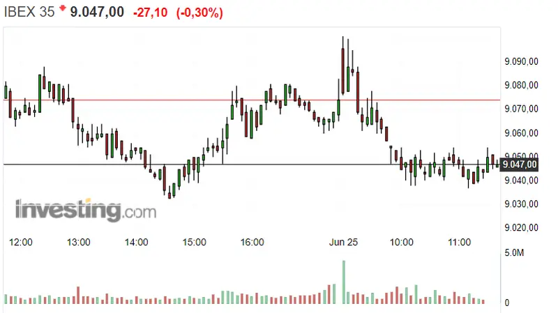 Tal y como podemos intuir tras leer el título, el índice español Ibex 35 se profundiza en alguna que otra bajada, lo que vemos en sus cotizaciones totalmente en rojo, dejando las cotizaciones del momento actual en unos 9047 puntos. La bajada hasta el momento actual de la que hemos sido testigos ha sido la de unos puntos; un 0.30%, de 27.10 puntos. Si nos centramos en sus niveles de resistencia y soporte, veremos el nivel de soporte en 9037.24 puntos y el nivel de resistencia en 9100.77 puntos. ¿Apostabas por el Ibex esta semana?