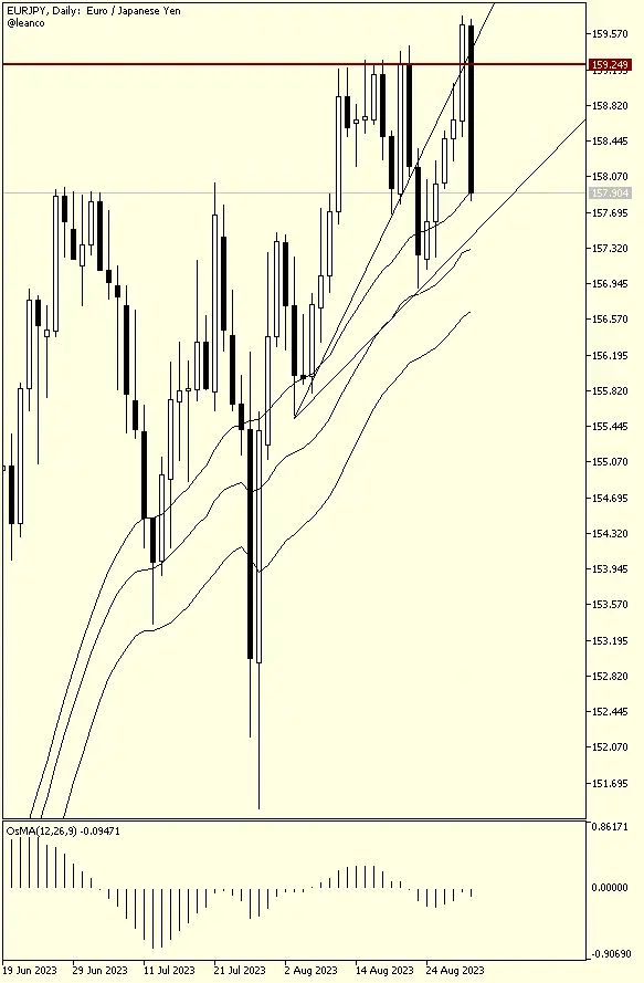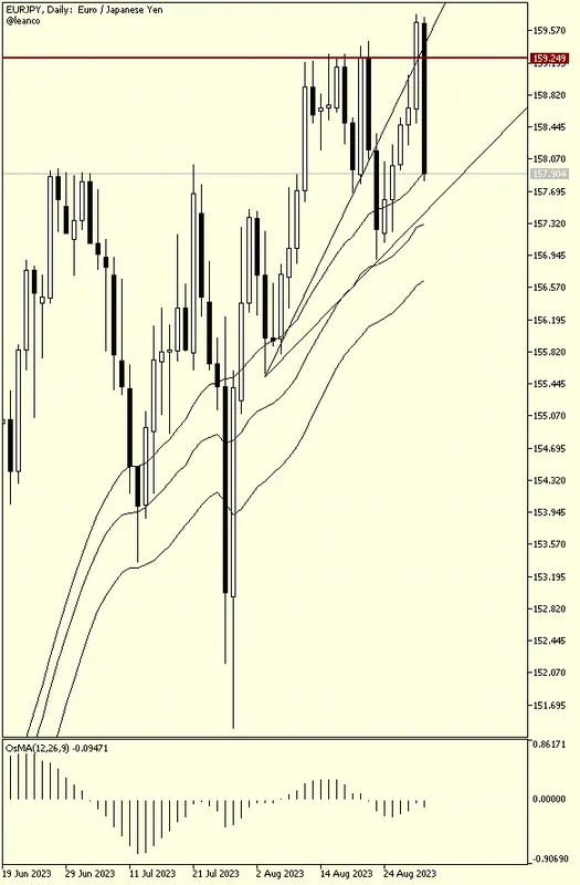 Hoy día 31 de Agosto del año 2023, vamos a analizar el desarrollo de los precios de uno de los cruces del euro con mas volatilidad, el par EURJPY, en sus intervalos de tiempos diario.
