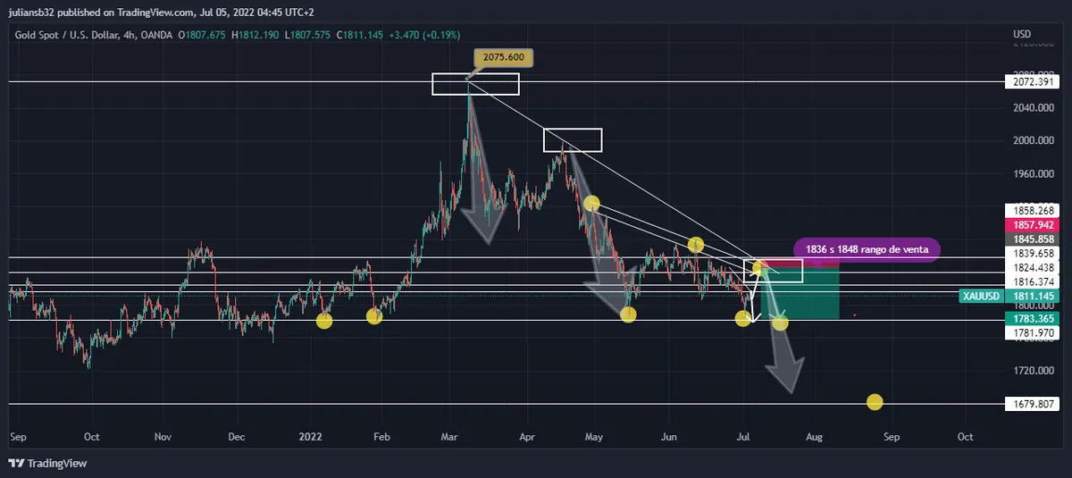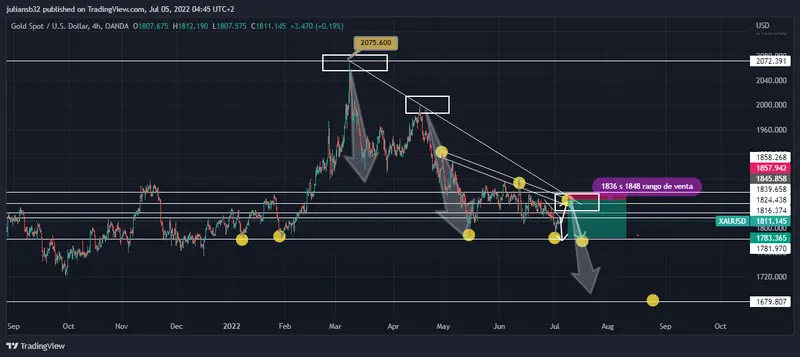 El Oro frente al dólar americano comenzó de una gran manera en el primer trimestre de este año y subió hasta la zona de 2075 usd en la sesión del 8 de marzo y ha caído desde ese máximo aproximadamente un 11 % , el precio se ha visto afectado por la demanda del dólar americano con subidas agresivas en mayo y junio, el precio favorece a ventas hasta desde esa perspectiva de subidas de tipos de interés y desde la perspectiva estructural el precio desde los máximos del mes de marzo viene formando máximos cada vez menores que forman una línea de tendencia bajista que actúa de resistencia y al llegar a esa zona el precio podría dar un segundo impulso, además el precio está limitándose también con los máximos menores de las últimas dos semanas, la zona clave para los vendedores esta en los 1836 a 1846, el precio al alinearse a esa zona estructural puede ir en búsqueda de un tercer impulso bajista como se observa en el siguiente gráfico: