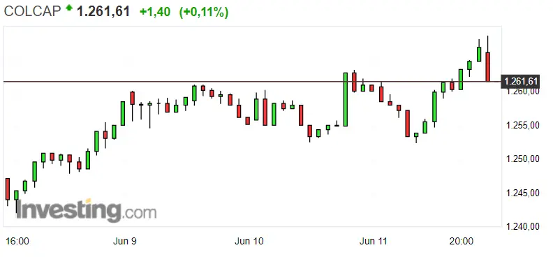 Como vemos en el gráfico de abajo, las cotizaciones del índice COLCAP se dirigen en línea alcista con una situación actual de 1361.61 puntos. Lo que iba sucediendo desde hace un tiempo era una situación en la que de los 1268.38 puntos de soporte, que elevaban hacia los 1268.38 puntos de resistencia. Es entonces cuando se desencadena la trayectoria hacia el momento actial de las cotizaciones del COLCAP; los 1261.61 puntos. Podemos resumir la situación del índice colombiano como una subida del 0.11%, que van siendo unos 1.40 puntos.