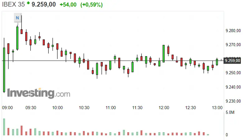 Las cotizaciones del índice español Ibex 35 se van manteniendo en unos 9259 puntos, se trata de una trayectoria de subida de un 0.59%, es decir, un ascenso de 54 puntos, que sigue manteniendo el índice español en verde. A la situación actual le precede una subida muy reciente que se traduce en un salto desde los 9212.08 puntos hacia los 9236.17 puntos, que al mismo tiempo es el nivel de soporte. La misma vela nos origina el nivel de resistencia de los 9291.26 puntos.