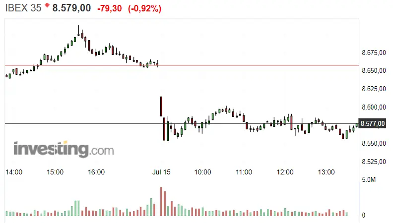 Como podemos comprobar más abajo, el indice Ibex 35, que es el indice de España, mantiene un actual nivel de 8577 puntos, lo que a lo largo de las últimas horas se nos traduce en una bajada de 79.30 puntos, es decir; de un 0.92%. El nivel actual se encuentra oscilando en la media móvil que van creando el nivel de soporte y resistencia. Encontramos el nivel de soporte en unos 8555.45 puntos, mientras que el de resistencia lo veremos en unos 8615.18 puntos. Un reciente salto bajista es lo que más nos llama la atención, con su origen en unos 8655.75 puntos. ¿En cuál de las acciones del Ibex 35 inviertes? Acciona, Acerinox, Grupo ACS, Aena, Almirall, Amadeus IT Group, ArcelorMittal, Banco Sabadell, Banco Santander, Bankinter, BBVA, CaixaBank, Cellnex Telecom, CIE Automotive, Enagás, Endesa, Ferrovial, Fluidra, Grifols, IAG, Iberdrola, Inditex, Indra Sistemas, Inmobiliaria Colonial, Mapfre, Meliá Hotels International, Merlin Properties, Naturgy, PharmaMar, Red Eléctrica Corporación, Repsol, Siemens Gamesa Renewable Energy, Solaria Energía y Medio Ambiente, Telefónica, Viscofan ¿Crees que es un buen momento para ello?