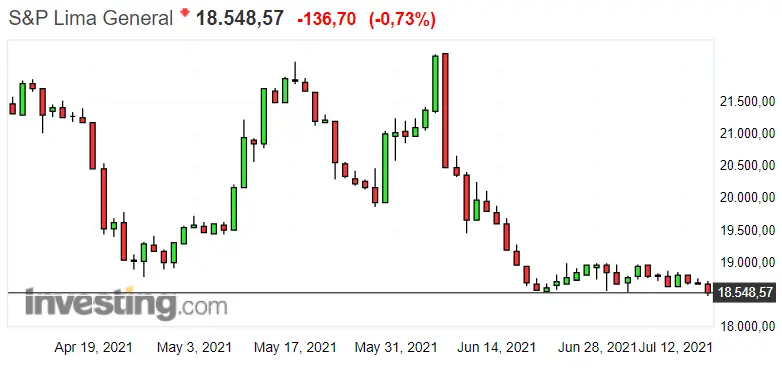 La Bolsa de Perú permanece vacilante entre dos puntos. En el índcie S&P Lima General lo que podemos ver es una actual bajada, que se deja ver a simple vista, pero que significa que su mercado sigue iluminado en rojo, manteniendo un nivel de 18548.57 puntos. Vemos en el gráfico de abajo, nieveles de soporte del índice peruano no demasiado más bajos al actual; se trata todavía de unos 18483.90 puntos, a los cuales descendía el S&P Lima General desde los niveles que consideramos de resistencia; 22261.37 puntos. Seguimos atentos a los impulsos aún más, recordando las bajadas del momento actual de un 0.73% y unos 136.70 puntos.