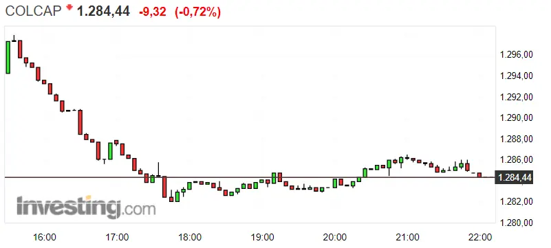 El índice colombiano COLCAP mantiene su trayectoria totalmente, y más en estos momentos, plenamente rojo; lo que nos da un nivel actual de 1284.44 traducida en bajadas de 9.32 puntos, es decir; del 0.72%. Encontramos las cotizaciones del índice COLCAP alejadas del nivel de resistencia que veíamos en los 1297.92 puntos. El índice pega un bajón muy renciente, como ya vamos comentando en el título, en el que se reduce al nivel de soporte de 1284.16 puntos, originando el actual de 1284.44 puntos.