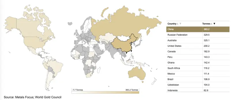 Esta rareza de la existencia y el coste de la extracción de este metal precioso se traduce directamente al precio del oro. Hasta ahora en todo el mundo se han extraído 192 mil toneladas del oro, incluido en el 2019 fueron 3531 toneladas. Desde hace muchos años sin cambios el mayor productor del oro es China - en el 2019 la extracción allí equivalía a 383 toneladas, el segundo y tercer lugar tiene respectivamente Rusia y Australia (Rusia en el año pasado extrajo 329,5 toneladas mientras que Australia 325 toneladas). Muy por detrás están los Estados Unidos, Canadá, Perú y Ghana.