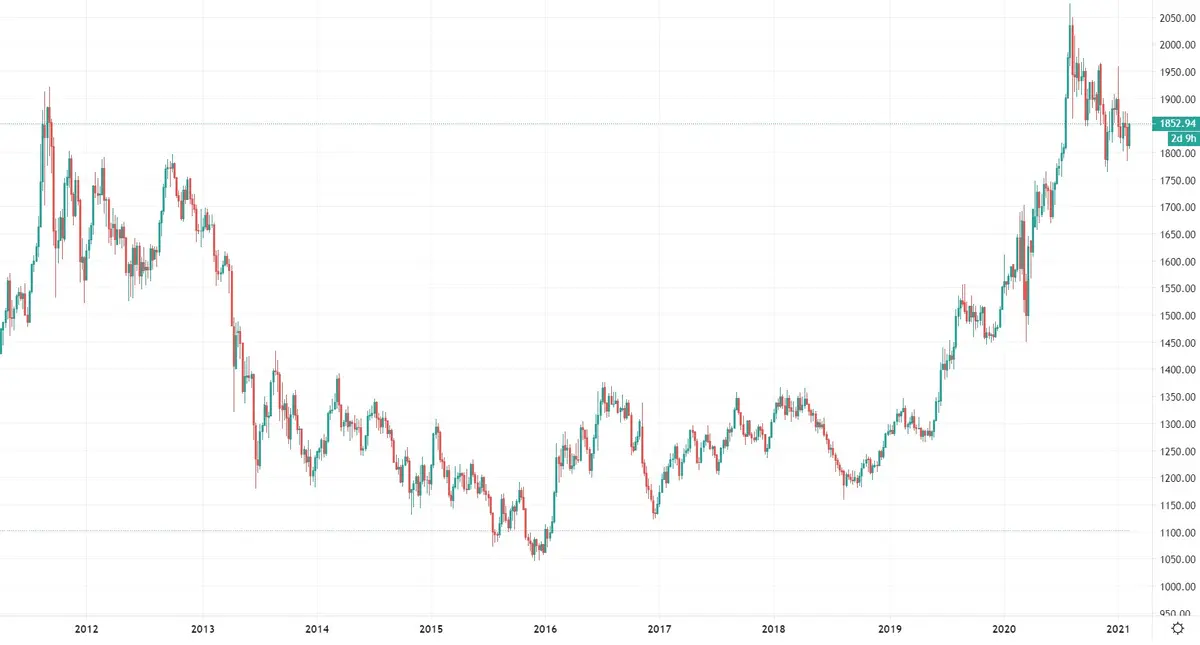 El precio del oro en los años 2012-2021 Fondo: tradingview.com