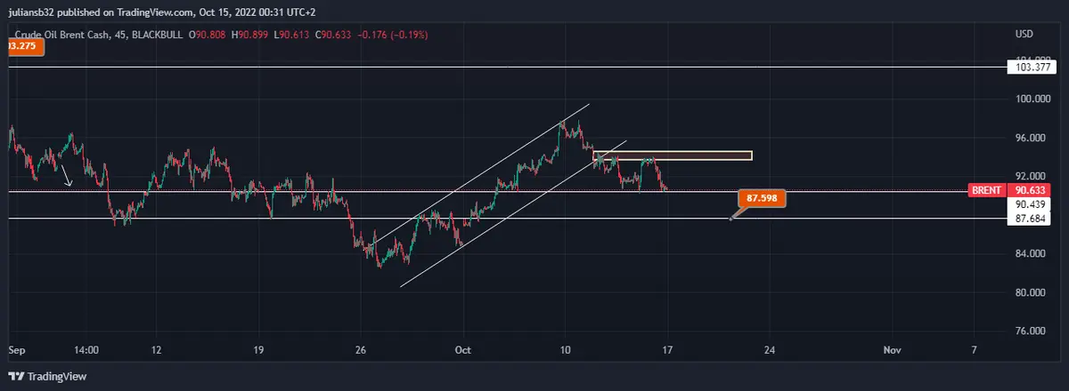 Gráfico del petróleo de referencia Brent en temporalidad de 45 minutos fuente tradingview