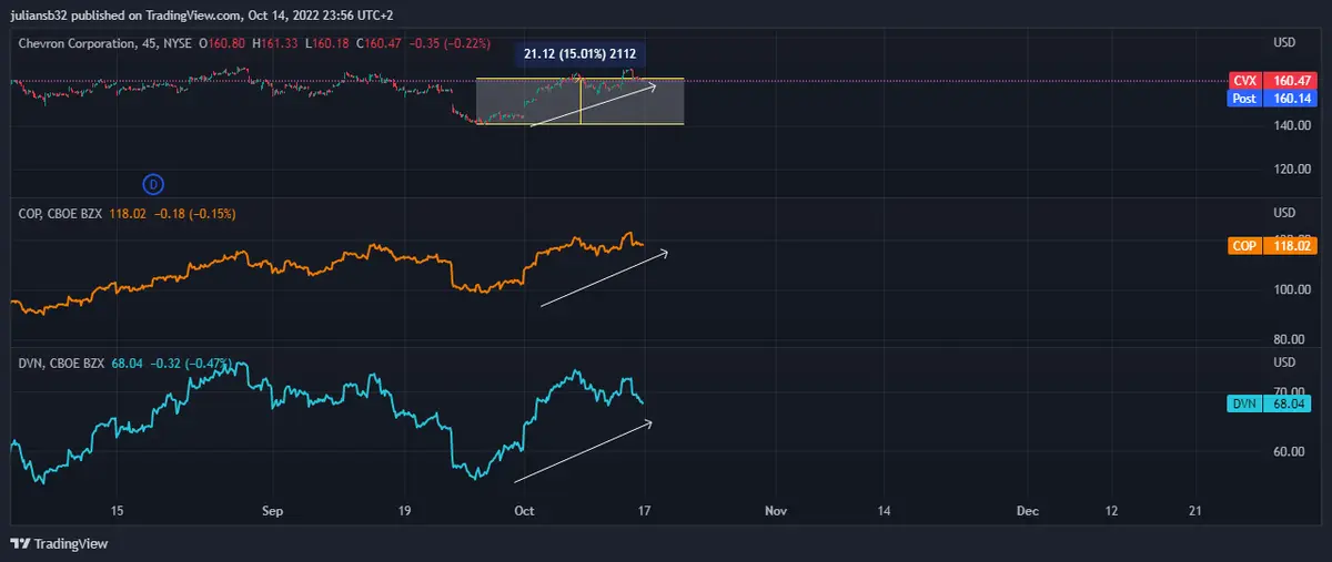 Gráfico de Chevron, Conocophilips, Devon Energy en temporalidad de 45 minutos fuente tradingivew