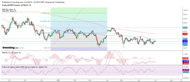 El crudo WTI inicia el mes con pocos avances también, pero sin festivo este martes, cotizando en los 70.16 dólares en rojo.
