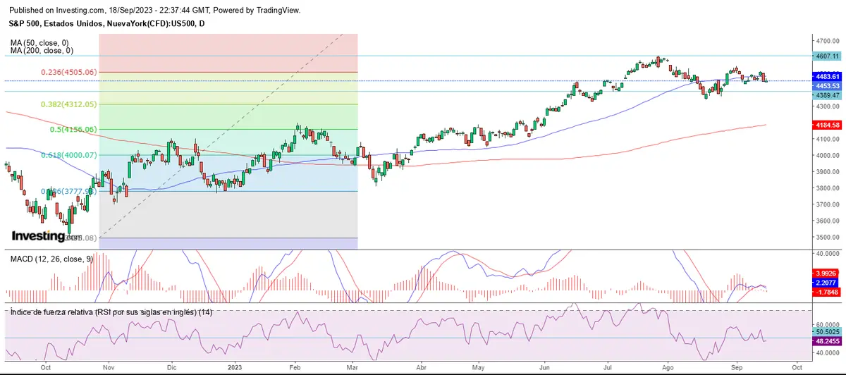 El S&P 500 abre la semana de la FED con una pequeña verde semanal, por debajo de la del viernes en los 4.453 puntos.