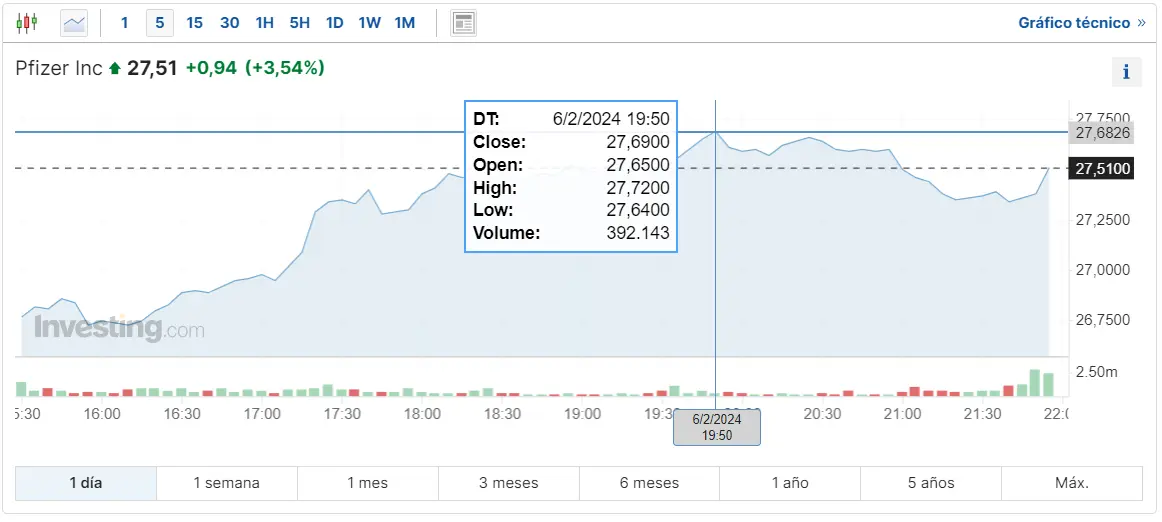 Pfizer ha experimentado un repunte en sus acciones, alcanzando un valor de alrededor de 27.51 dólares por acción, lo que representa un aumento del 3.54%. Este incremento se traduce en una subida de aproximadamente 3.54 euros por acción desde los mínimos de 26.75 dólares, llegando a un máximo de 27.6826 dólares. El volumen de la empresa se sitúa alrededor de los 392.143 dólares (USD).