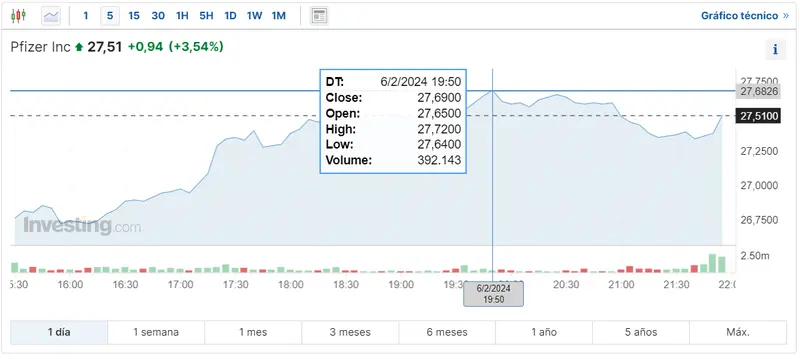 Gráfico de las cotizaciones de las acciones Pfizer en un espacio de tiempo de un día