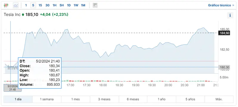 Gráfico de las cotizaciones de las acciones Tesla en un espacio de tiempo de un día