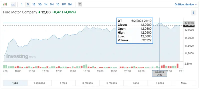 Gráfico de las cotizaciones de las acciones Ford Motor en un espacio de tiempo de un día