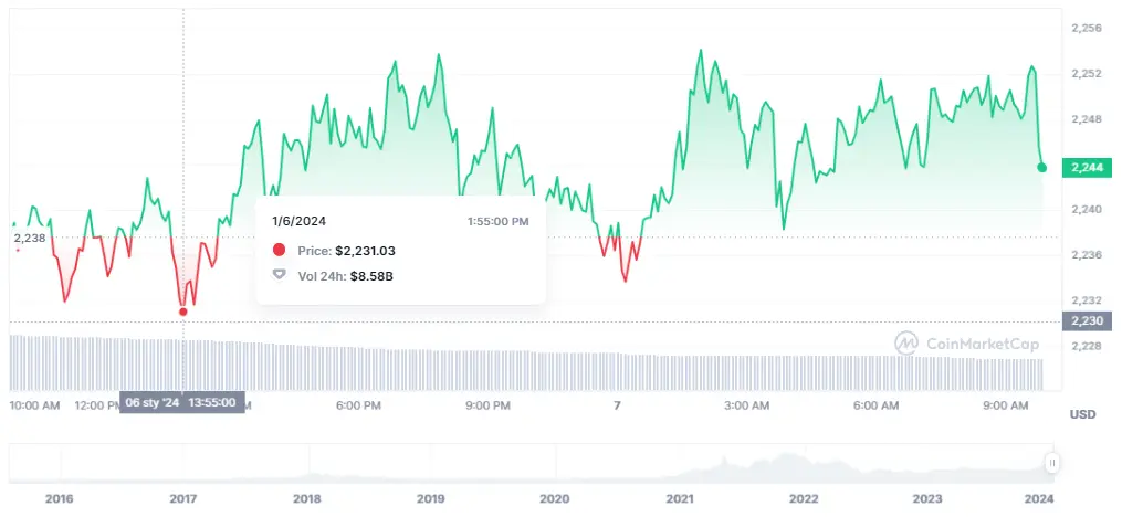 Lo más curioso son las subidas que van subiendo un 0.66% en los momentos de las últimas 24 horas, subiendo los valores de Ethereum desde los valores de 2231.03 dólares hacia las cotizaciones más altas de hasta unas cotizaciones de 2.254 dólares (USD), subiendo en la última hora un 0.03%, cayendo por el contrario un 1.72% en los últimos siete días. Ahora mismo las cotizaciones de Ethereum equivalen a unos niveles de 2252.48 dólares. Las subidas de Ethereum avanzan en sus subidas, dejando a su paso una capitalización del mercado que llega hasta los 270.714.000.176 dólares.