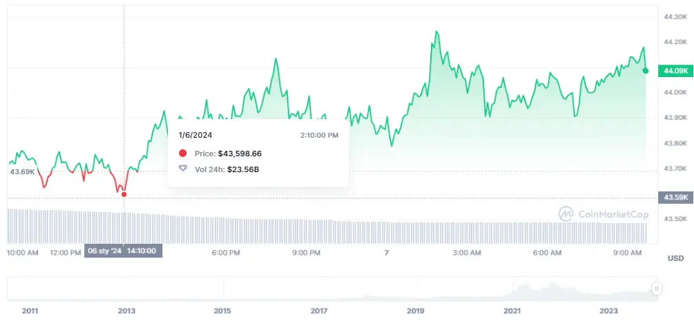 El precio de la criptomoneda más popular nos está dejando frente a unas subidas que se van yendo por unos niveles cada vaz más impactantes en sus alzas. Este momento resulta interesante para el precio del Bitcoin con sus subidas del 1.01% del último día, creciendo en el espacio de tiempo de la última hora unos valores de hasta un 0.17%, alcista hasta cotizar unos 44.09 mil dólares por unidad de la criptomoneda, creciendo desde el mínimo propio de los 43.59866 USD.