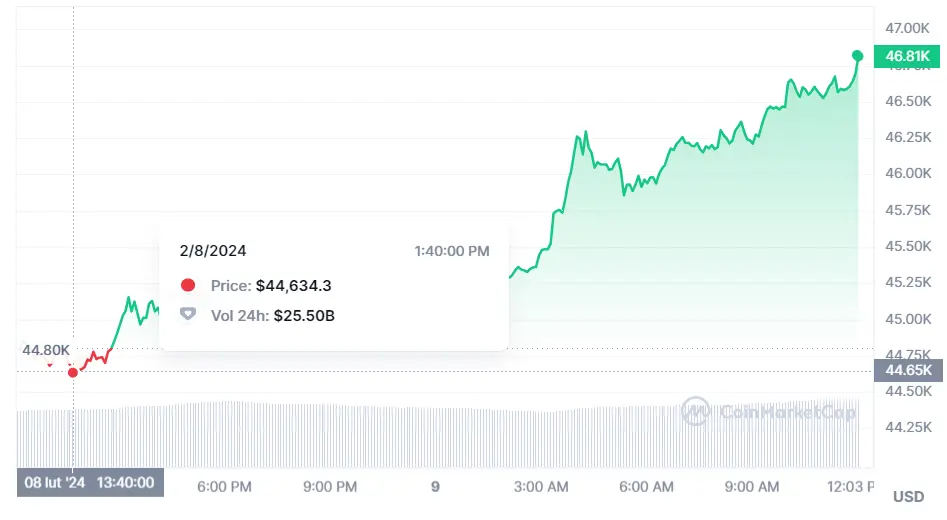 La criptomoneda principal, el bitcoin (BTC), continúa su tendencia al alza, alcanzando casi los 46.600 dólares, su punto más alto desde el 11 de enero. Este incremento del 2.8% a las 10:30 horas marca un aumento del 21% desde su mínimo de 38.500 dólares el 23 de enero. La aprobación por parte de la SEC de la creación de fondos cotizados vinculados al bitcóin ha contribuido a este repunte, luego de que gigantes como BlackRock, Fidelity y Grayscale solicitaran autorización para crear estos ETF. Aunque el bitcóin experimentó una fuerte subida el 11 de enero tras la noticia, se desplomó un 6% al día siguiente, antes de recuperarse gradualmente y superar los 39.000 dólares en los últimos días.