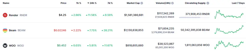 El precio de Beam en riesgo (26.21%), ¿cuánto cotiza Render y WOO hoy?
