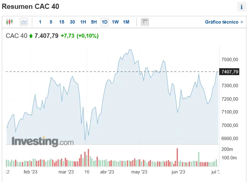 El índice galo, el CAC 40 se situa en los 7407,79 puntos, tras experimentar una subida del 0,10%