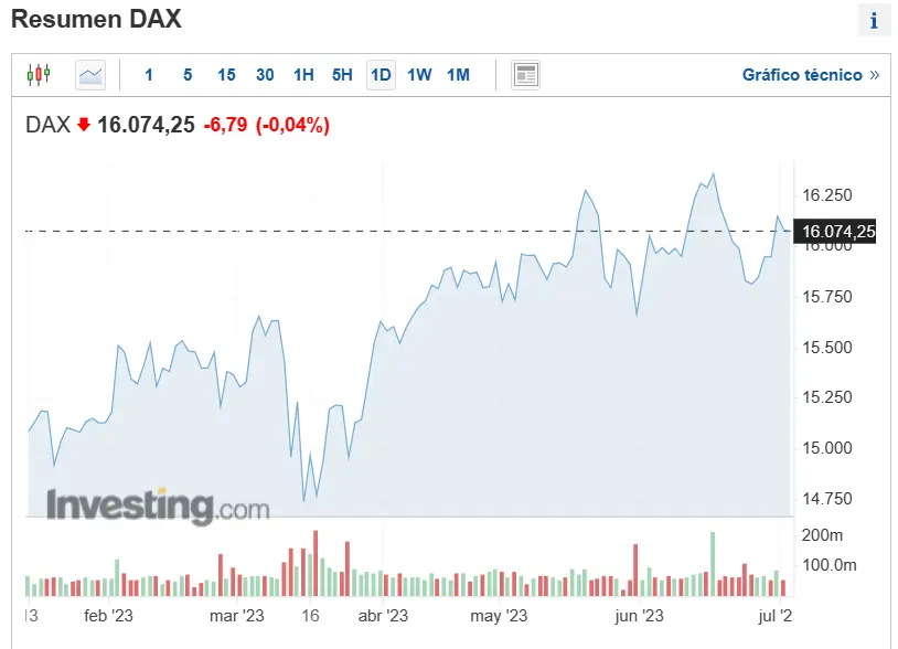 El Índice alemán el DAX obtiene una revalorización del 0,16% y le sitúan en los 16173,21 puntos