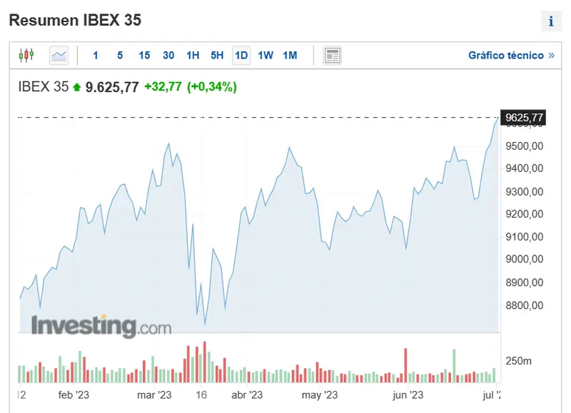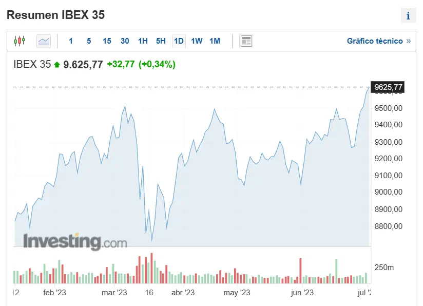 El selectivo español apunta hacia los 10000 puntos, después de haber obtenido una revalorización del 5% en junio, del 3% entre abril y junio y un 15,5% en lo que lleva de año 2023