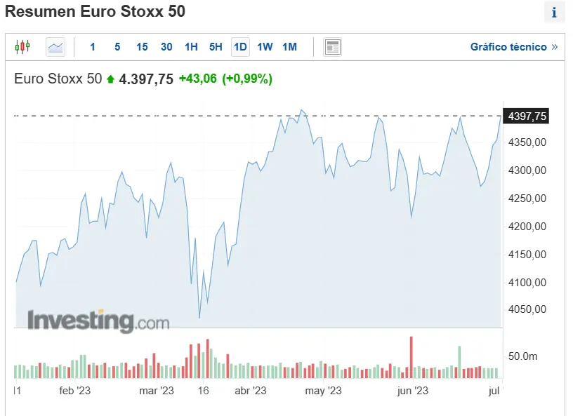 En estos momentos, el índice EuroStoxx 50 se encuentra en los 4397,75 puntos, tras experimentar un alza del 0,99% y obtener unas ganancias de 43,06 puntos