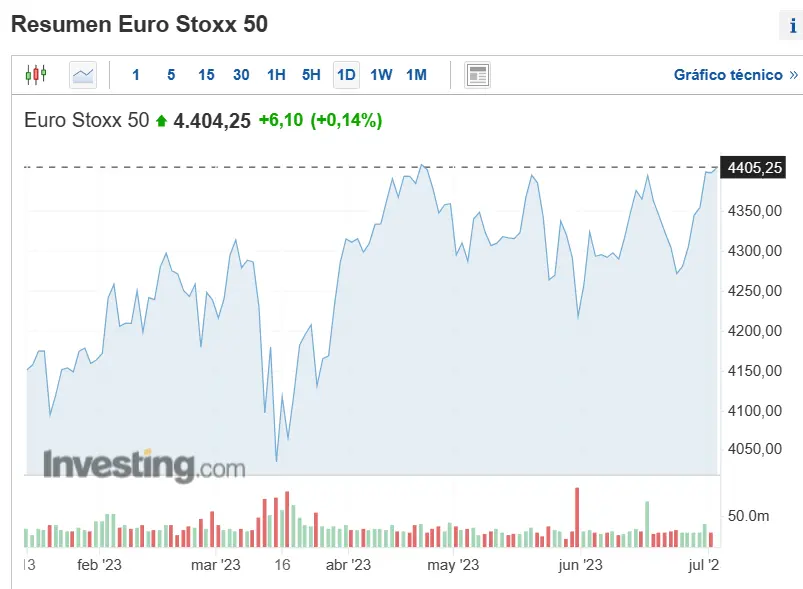 En estos momentos, el índice EuroStoxx 50 se encuentra en los 4337,25 puntos, tras experimentar un alza del 0,74% y obtener unas ganancias de 31,99 puntos