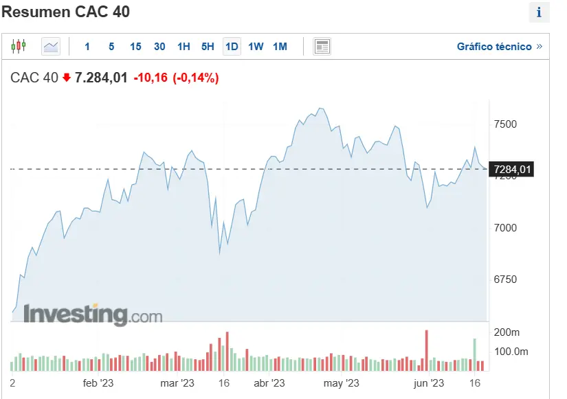 El índice galo, por el contrario, el CAC 40 está en rojo. Tras haber perdido un 0,14% y dejarse en el camino 10,16 puntos, el índice bursátil francés se sitúa en estos momentos en los 7284.01 puntos