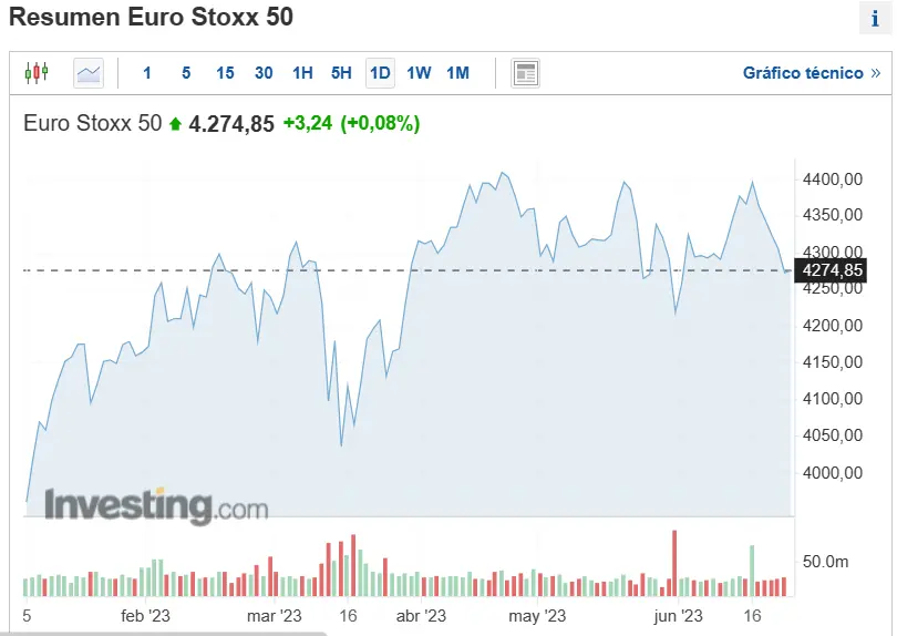 En estos momentos, el índice EuroStoxx 50 se encuentra en los 4274,85 puntos, tras experimentar un alza del 0,08% y obtener unas ganancias de 3,24 puntos