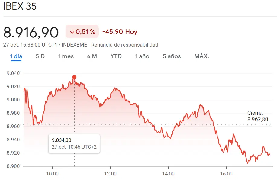 Gráfico de las cotizaciones del índice Ibex 35 en un espacio de tiempo d eun día