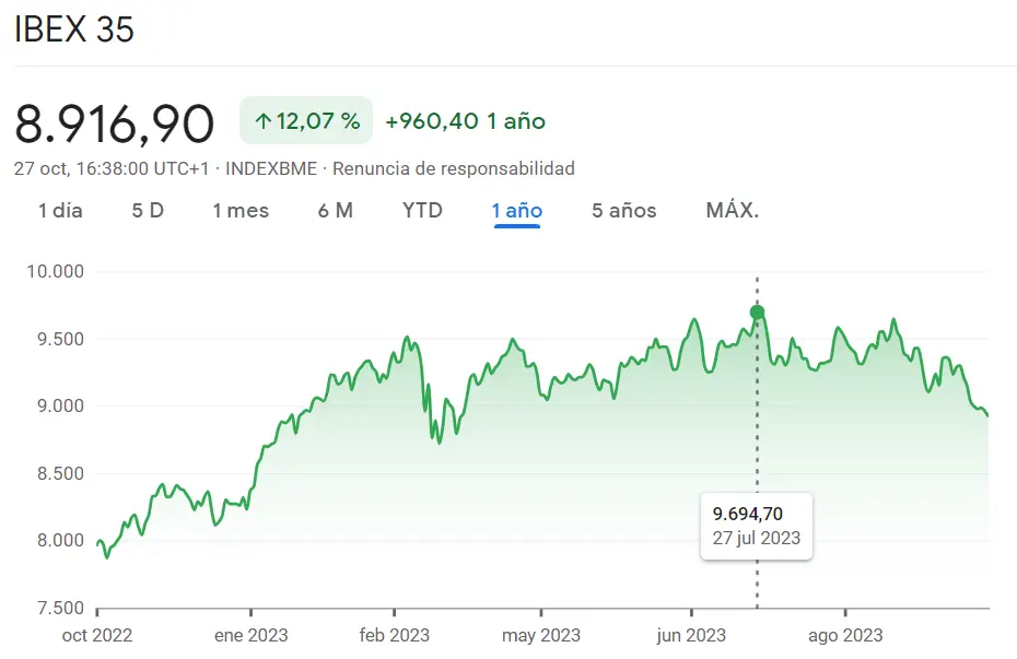 Gráfico de las cotizaciones del índice Ibex 35 en un espacio de tiempo de un año