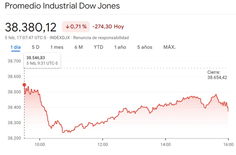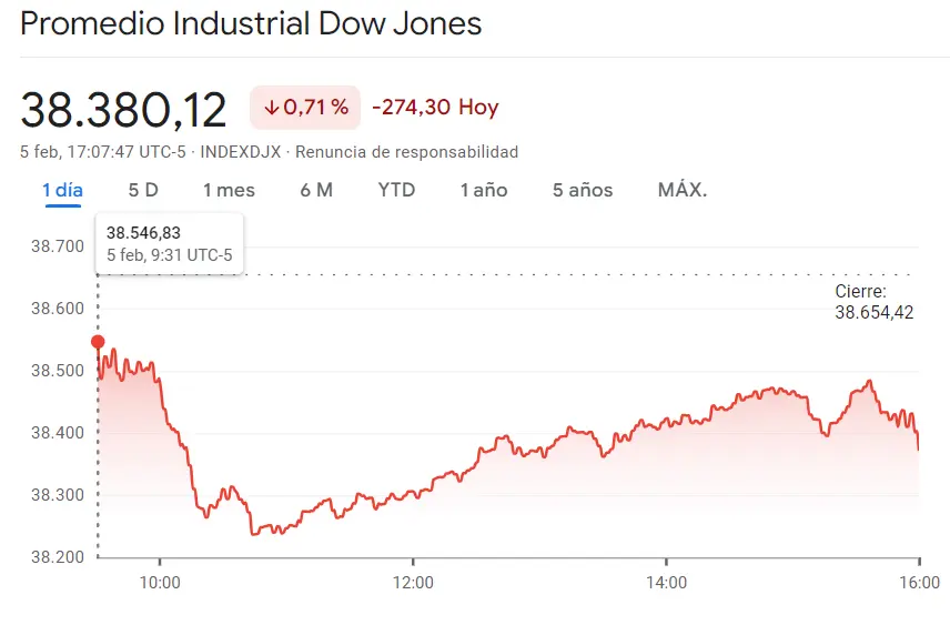 Esta mañana de día 6 de febrero, el panorama financiero actual refleja una tendencia negativa para el índice Dow Jones, que continúa su declive con una disminución del 0.71%. En consonancia con esta situación, Wall Street anticipa una caída del 2%, lo que augura momentos desafiantes para los inversores. Este escenario pesimista sugiere que el índice SP500 podría experimentar una derrota en las próximas sesiones, lo que insta a un análisis cauteloso del mercado.