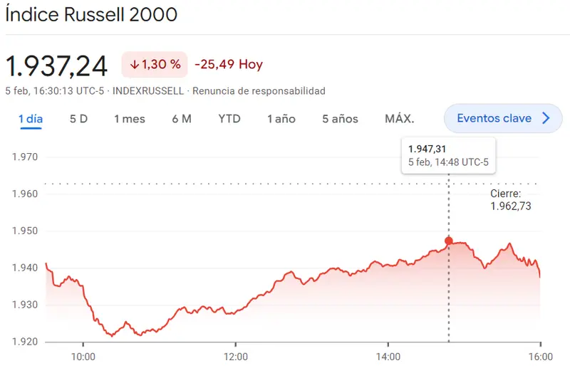 El índice Russell 2000 está experimentando una tendencia bajista en el mercado de Wall Street ahora mismo, situándose en torno a los 1937.24 puntos, reflejando una disminución del 1.3% y una caída de aproximadamente 25.49 puntos desde su último cierre. Aunque estas cifras permanecen por debajo de los niveles de cierre anteriores de alrededor de 1962.73 puntos, todavía no alcanzan los mínimos registrados en torno a los 1920 puntos. ¡Esto es lo que ha pasado con el índice Russell 2000!