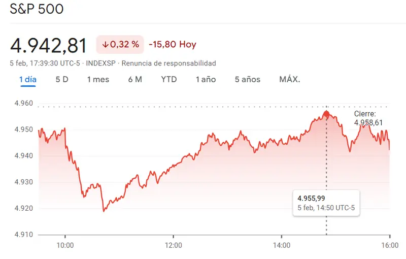Los índices de Wall Street muestran un ambiente predominantemente bajista, aunque con algunas señales de recuperación que podrían impulsar al índice SP500 hacia niveles más positivos. En este momento, el SP500 se sitúa en torno a los 4942.81 puntos, habiendo alcanzado recientemente los 4955.99 puntos, lo que representa una caída de aproximadamente 15.8 puntos desde el cierre anterior de unos 4958.61 puntos. Sin embargo, aún se mantienen por encima de los mínimos registrados en torno a los 4920 puntos.