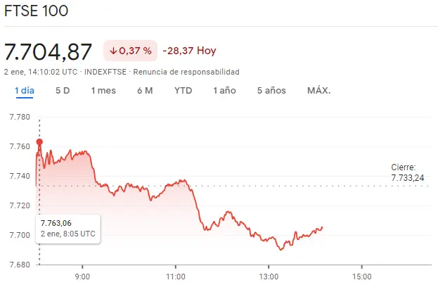 El gran mercado británico parece haber empezado el año con el pie izquierdo observando sus caídas en unos niveles que van marcando cada vez más el desastre financiero de estos instantes. Este momento marca unos 7704.87 puntos por el índice FTSE 100, dejándose su valor más bajo en apenas unos 7690 puntos. No todo momento ha sido tan bajista como el visto. Hasta el momento actual hemos encontrado niveles mucho más altos, esto quiere decir que el valor máximo lo seguimos encontrando en hasta unos 7763.06 puntos.