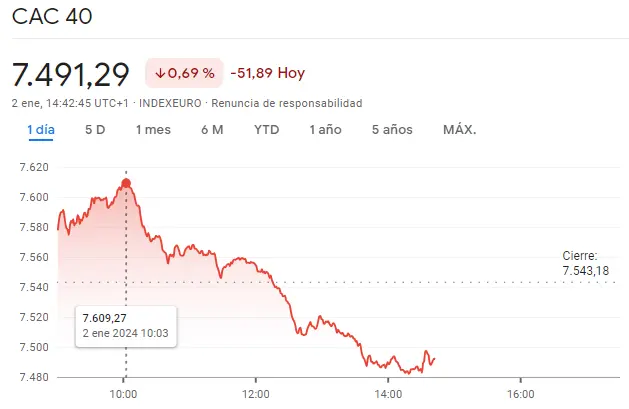 Gráfico de las cotizaciones del índice CAC 40 en un espacio de tiempo de un día