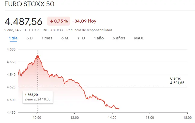Las cotizaciones de estos instantes caen en gran medida con lo último que ha ocurrido en el mercado de valores europeo. En cuanto a lo que ha ocurrido en el índice EuroStoxx 50 han sido unas caídas que hay llegado a caer hasta un 0.75%, derrumbándose el índice Euro Stoxx 50 hasta caerse las cotizaciones en unos 34.09 puntos, decreciendo desde los valores más fuertes como los máximos de unos 4568.2 puntos, bajando a unos mínimos de estos instantes de unos valores de 4487.56 puntos, con unas caídas que nos dejan muy por debajo de los niveles del cierre de sesión del año 2023 de unos 4521.65 dólares.