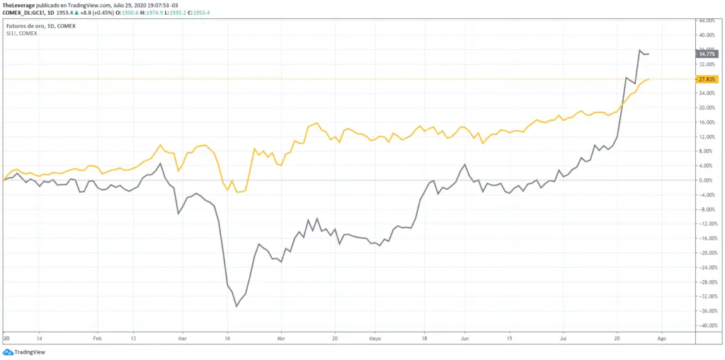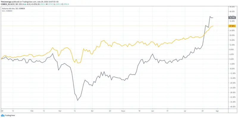 En lo que va de 2020, el precio de futuros del oro se ha revalorizado un 28%, mientras que la plata lo ha hecho un 34%, siendo en este último caso más fuerte todavía la subida desde los mínimos de marzo.
