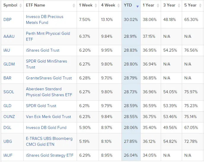 En materia de ETFs de oro, estos no han sido ajenos a la subida de precios. En lo que va del año algunos de los fondos indexados con mejor performance han tenido rendimientos en el entorno del 30%, presentando buenas oportunidades para aquellos inversores en busca de mayor seguridad.