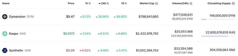 La criptomoneda Dymension en hasta un 36.9% alcista ¿Cuánto cuesta un kaspa? Cotizaciones del Synthetix con su 5.41% disparado