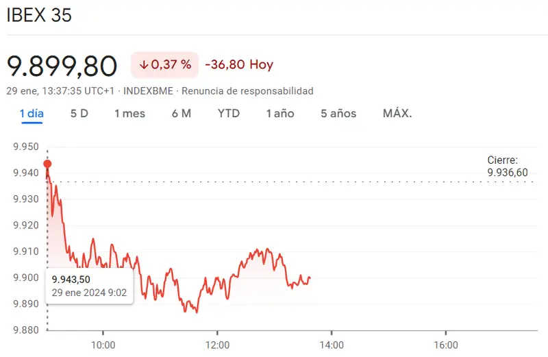 El índice español, Ibex 35, tampoco ofrece demasiado buenos resultados, teniendo en cuenta sobre todo la gran caída que suponen los momentos iniciales de la sesión. Esta mañana la sesión del Ibex 35 ha arrancado con unos valores máximos de unos niveles de hasta unos 9943.5 puntos, que se encontraban aún por encima de las cotizacines del cierre de sesión de unos 9936.6 puntos. Entre las cotizaciones más fuertes que hemos podido encontrar en el índice en cuestión nos hemos encontrado unos valores de caída de unos 36.8 puntos, creciendo un porcentaje de hasta un 0.37%.