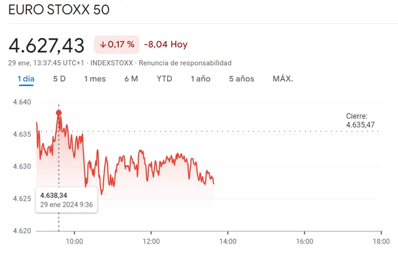 Gráfico de las cotizaciones del índice Euro Stoxx 50 en un espacio de tiempo de un día