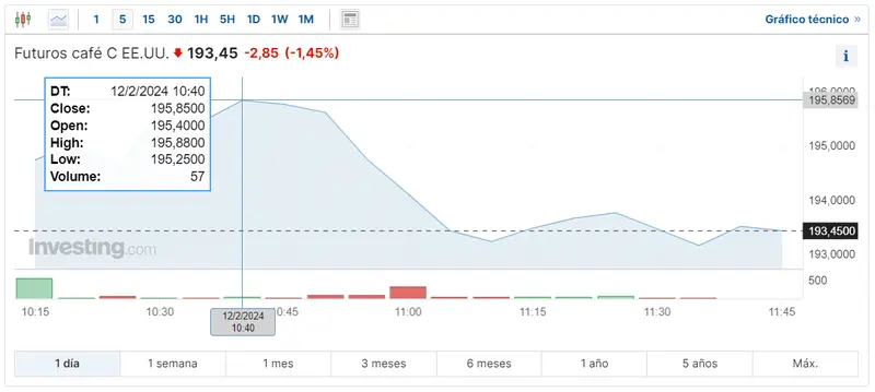 Gráfico de las cotizaciones del café en un espacio de tiempo de un día
