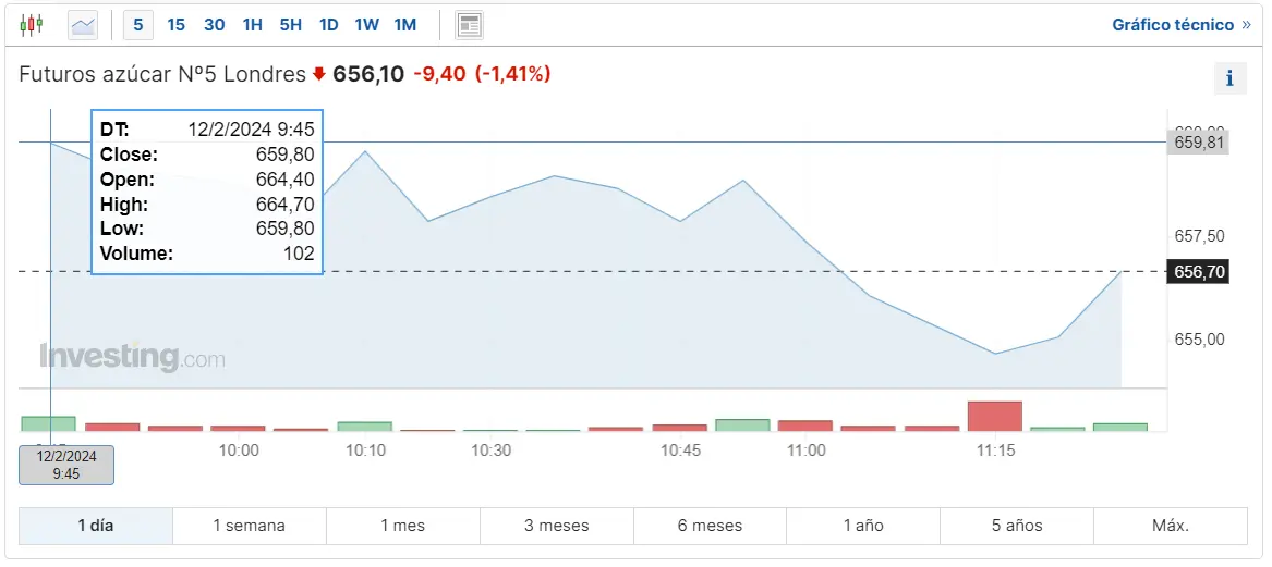Gráfico de las cotizaciones del azúcar en un espacio de tiempo de un día