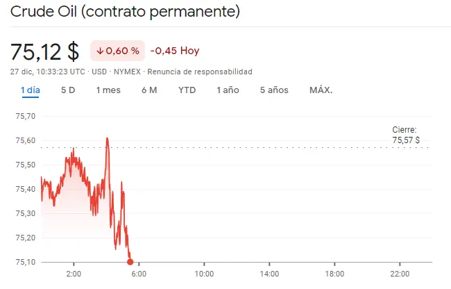 El precio del petróleo crudo está volviendo a caer en unos niveles que reducen por completo los niveles que podríamos estar esperando de este crudo. Ahora mismo las cotizaciones del petróleo crudo vienen marcando unos niveles de unos 75.12 dólares (USD) cayendo ahora mismo un 0.6%, reduciéndose unos 0.45 dólares, perdiendo una gran cantidad de valor comparando las cotizaciones actuales con los valores que los inversores han podido observar en unos valores máximos de hasta unos 75.61 dólares con un cierres de sesión previo de unos 75.57 dólares.