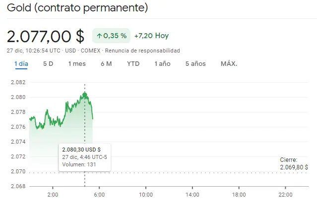 El precio del oro el día de hoy nos está llevando por las cotizaciones del oro en estos instantes, creciendo en las horas desde el inicio de la sesión, animándose el precio del oro por unos valores que van subiendo a los actuales 2077 dólares. El metal precioso estas últimas horas se encuentra definitivamente por encima de las cotizaciones de los últimos cierres de sesión de unos 2069.8 dólares por el oro. En cuanto a las subidas que hemos podido encontrar hoy, hemos visto unas pendientes alcistas de un 0.35%, animándose unos 7.2 dólares, encontrando en los momentos más fuertes valores de hasta 2080.3 USD.