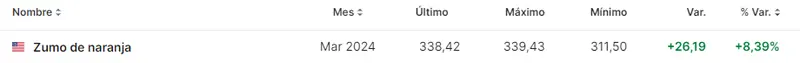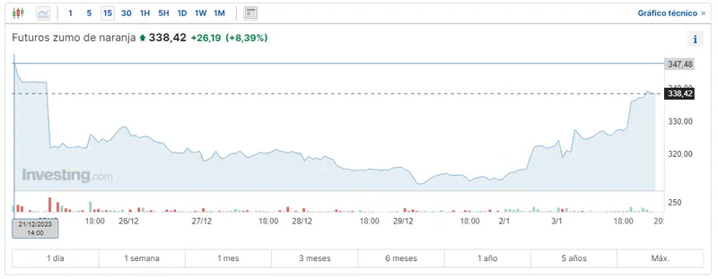 Las cotizaciones del zumo de naranja está elevando los valores de su mercado, creciendo el precio del zumo de naranja en unos valores alcistas de un 8.38%, lo que nos trae alzas de unos 26.19 dólares por el activo del zumo de naranja, elevándose unas cotizaciones increíbles con alzas que van hacia las cotizaciones actuales de unos 338.42 dólares. En estos momentos, el zumo de naranja cotiza unos valores que no llegan a las cotizaciones máximas que los inversores han visto en los 347.48 dólares, mientras los mínimos se dejaban ver aún en las cotizaciones de unos 310 USD.