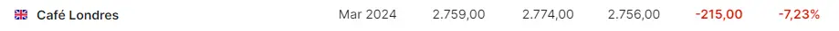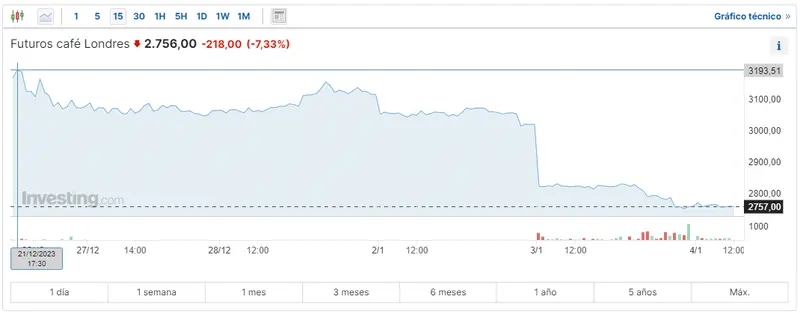 Gráfico de las cotizaciones del café Londres en un espacio de tiempo de un día