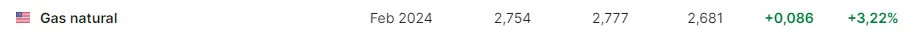 Las cotizaciones del gas natural de estos instantes están encontrando unas subidas con alzas de un 0.088 dólares viéndose en estos momentos los valores de la commodities en hasta unos valores de unos 2.756 dólares por el gas natural. El precio del gas natural ahora mismo viene cotizando unos niveles bastante próximos a las cotizaciones de unos 2.7737 dólares frente a las caídas que el precio del gas natural ha visto en sus valores mínimos de unos 2.5000 USD.
