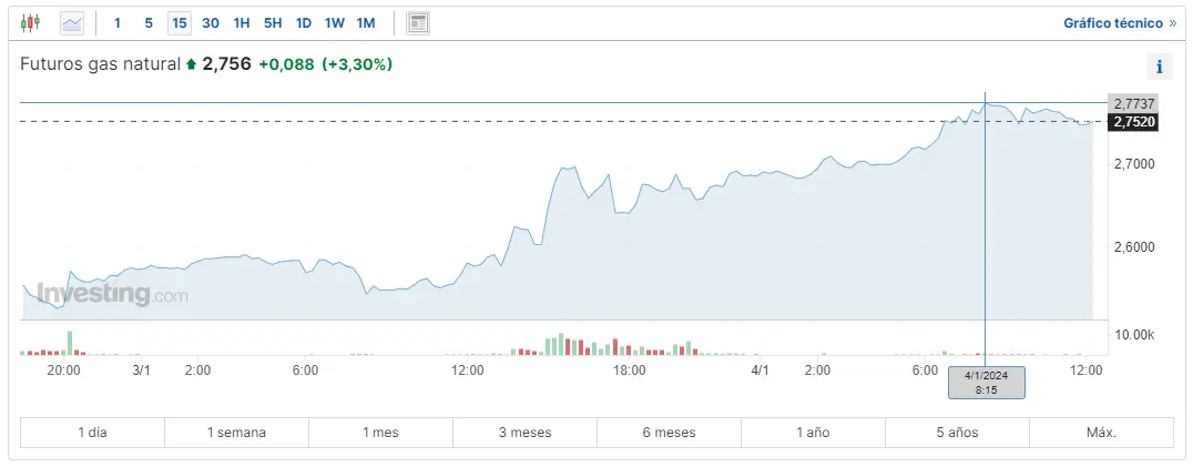 Gráfico de las cotizaciones del gas natural en un espacio de tiempo de un día